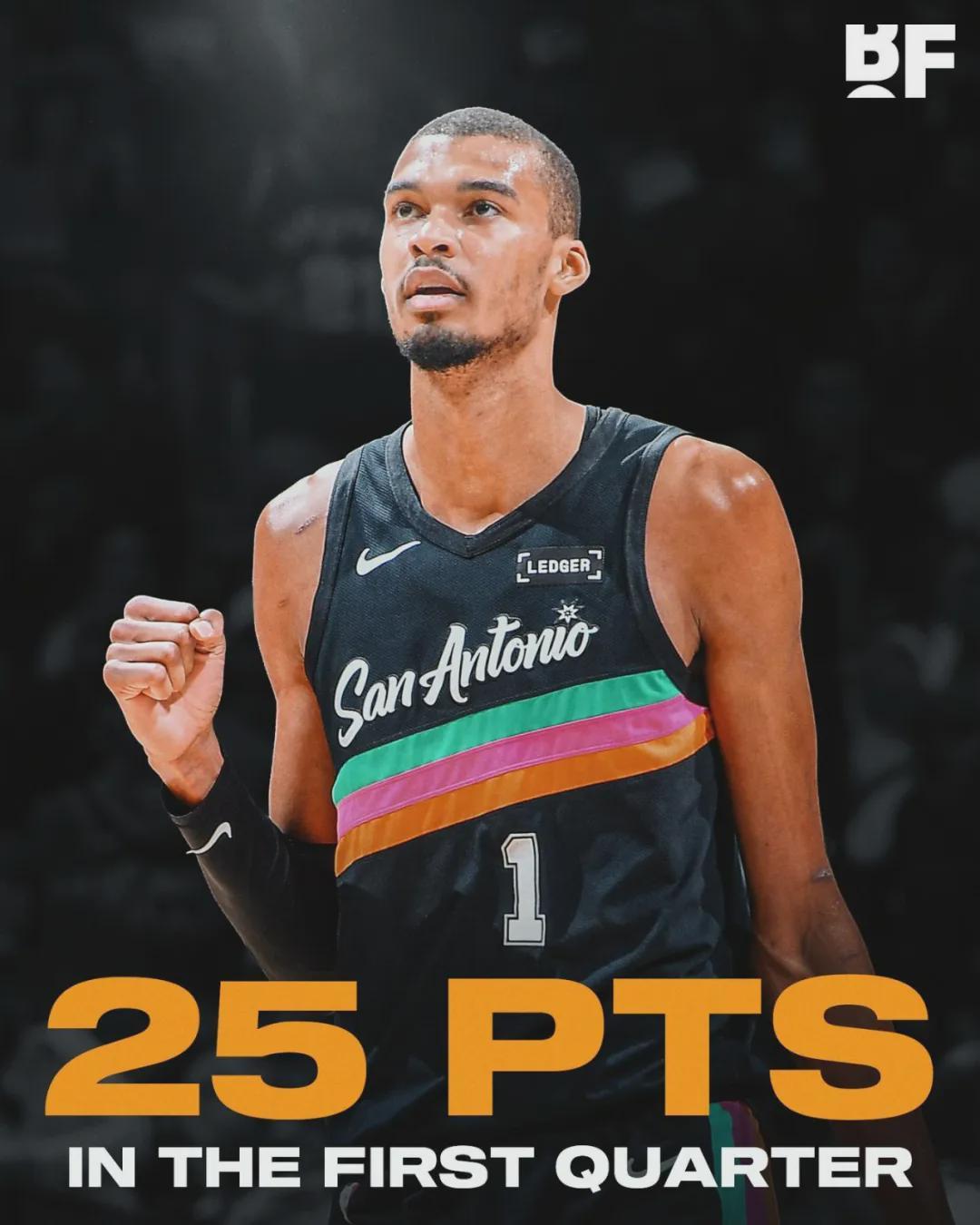 湖人进攻还算不错,首节得到30分,但马刺全队单节轰下47分。文班亚马第一节只打了8分钟,9投8中狂轰25分3篮板1抢断1盖帽,一个人打爆湖人全队。第二节海斯多次在篮下单挑文班亚马,一个人连拿7分,随后湖人连续失误。