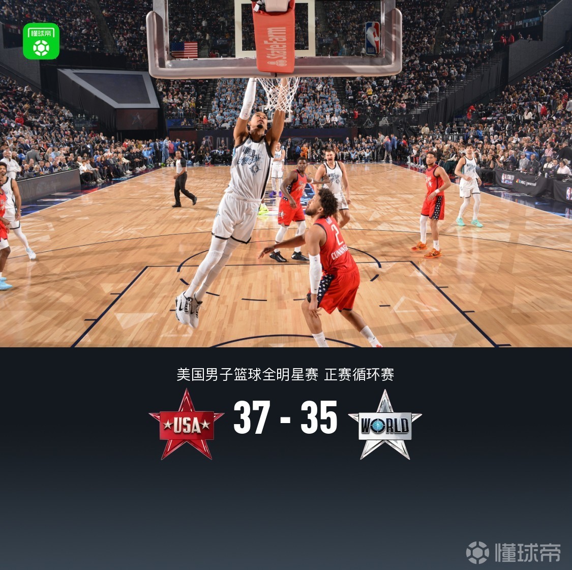 美国星辰队37-35加时险胜世界队,巴恩斯三分绝杀,文班亚马空砍14+6