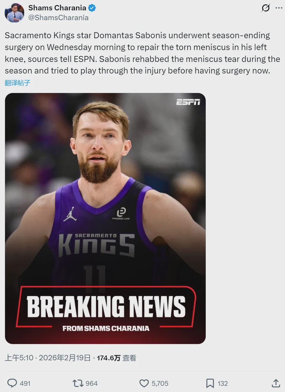 Shams:小萨博尼斯接受左膝半月板修复手术,赛季报销